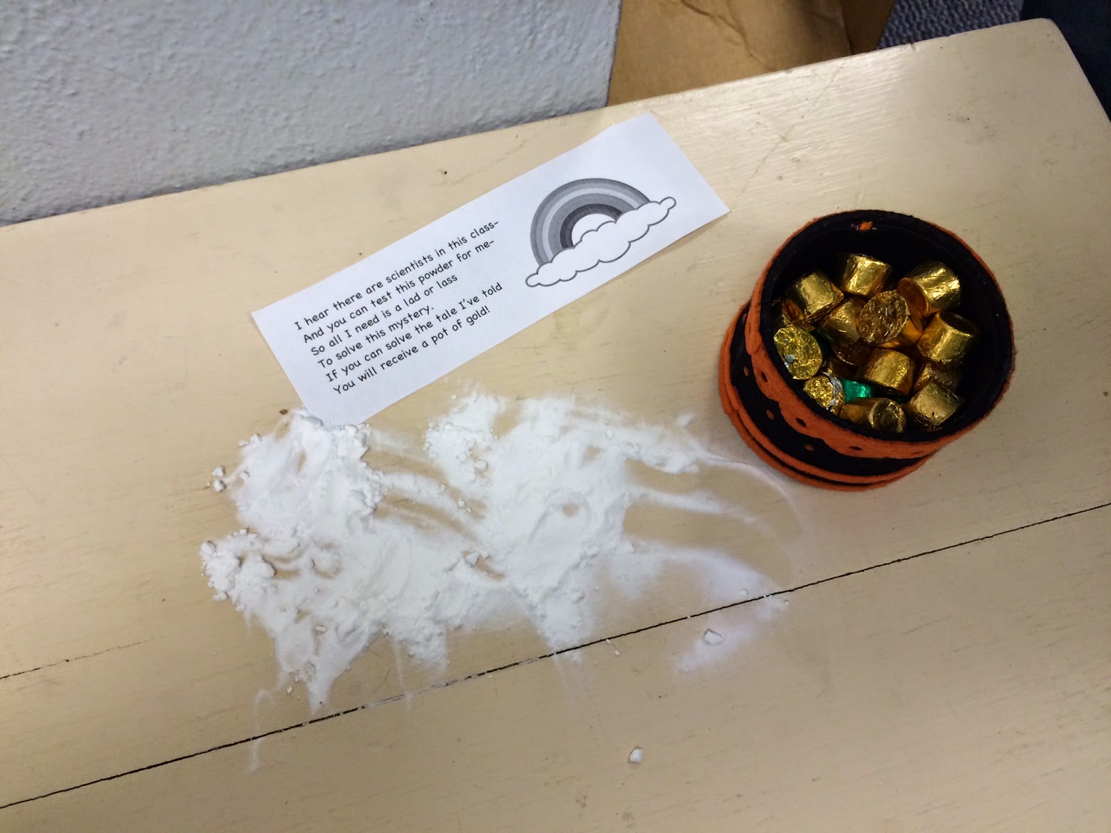 We had to figure out what the powder he left behind was so we could earn his pot of gold! Good thing we just studied what happens when different materials are mixed with water and vinegar the day before in science! After a quick experiment we discovered that the mystery powder was BAKING SODA!!